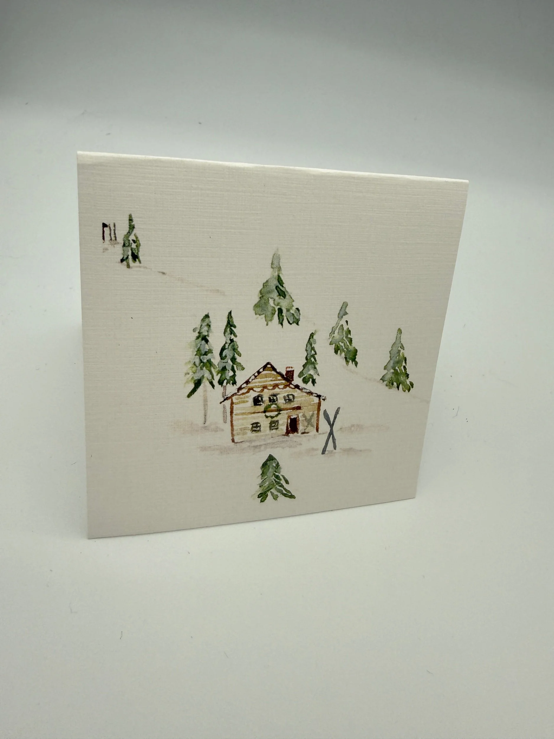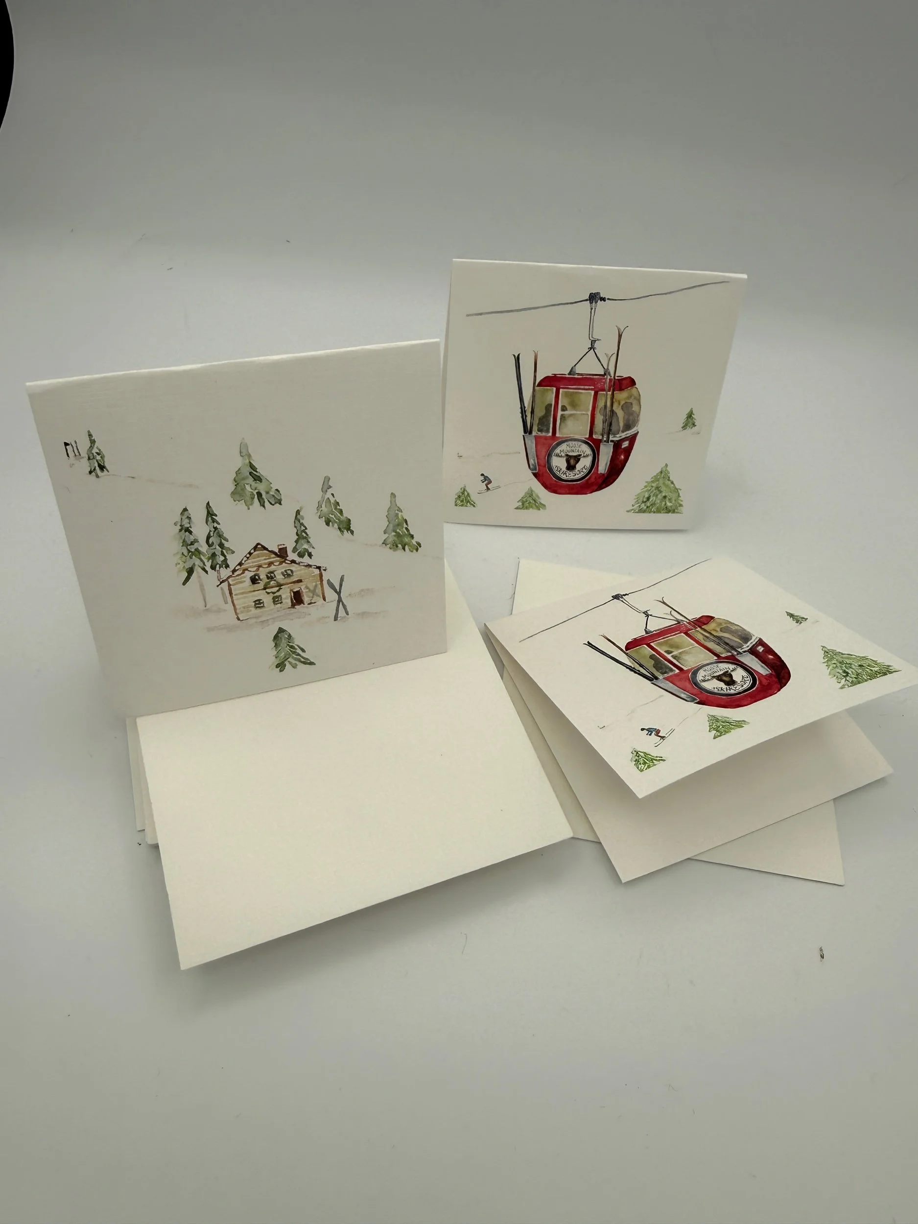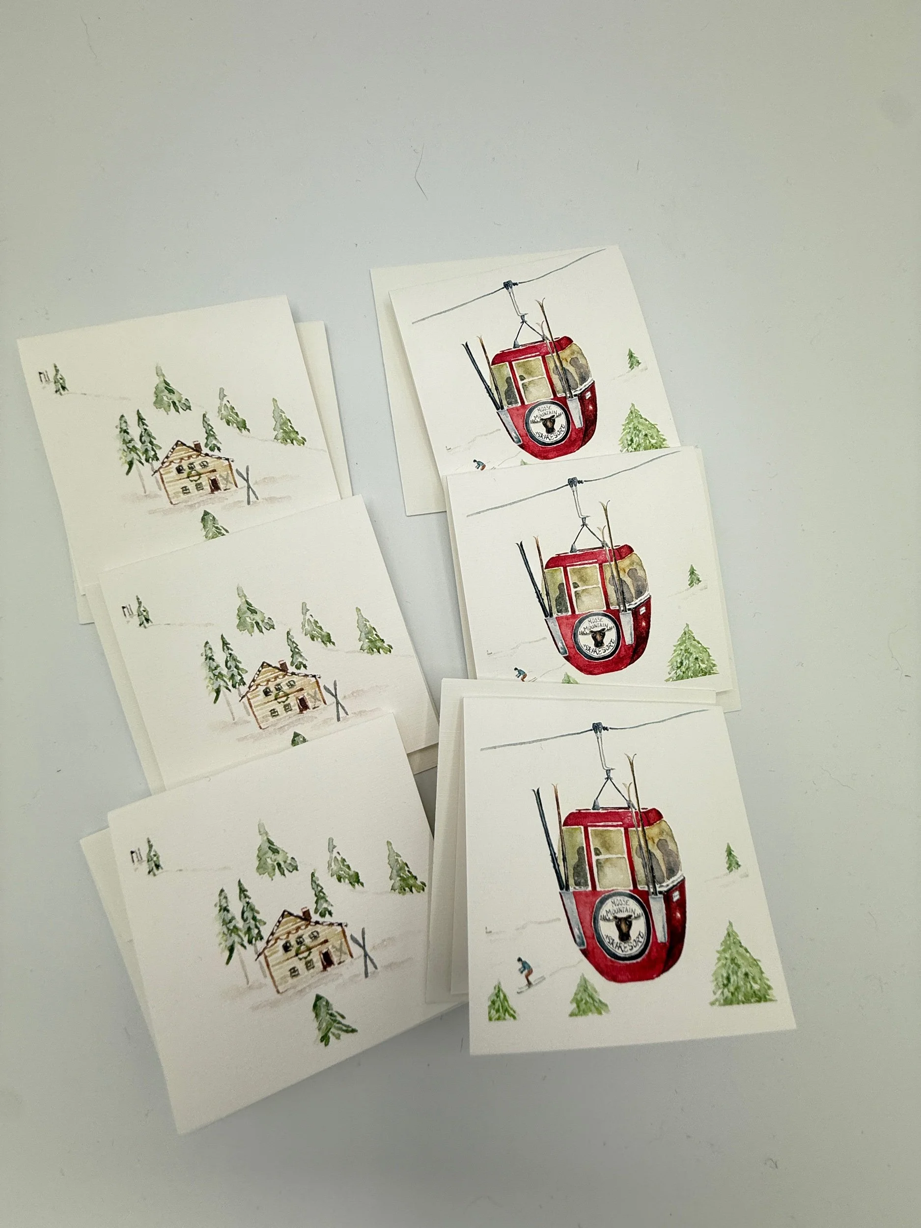 This sweet mini card set includes 6 3”x3” cards printed on linen textured paper with envelopes. Each card is blank on the inside and comes with a protective sleeve. The set includes 3 gondola cards and 3 ski chalet cards. These make great gift tags!