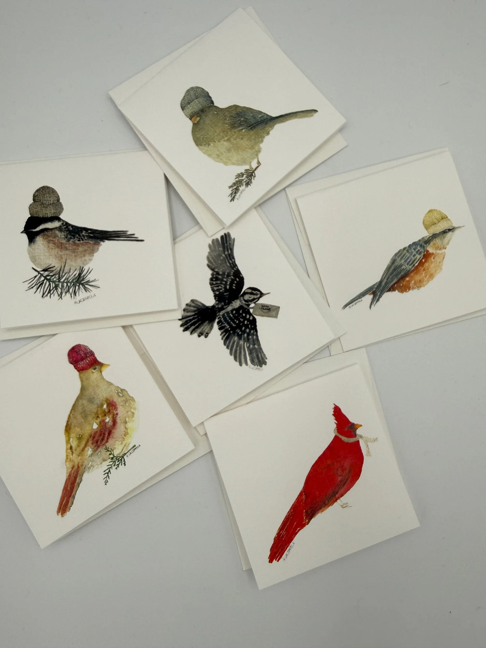 This sweet mini card set includes 6 3”x3” cards printed on linen textured paper with envelopes. Each card is blank on the inside and comes with a protective sleeve. The set includes 6 different songbird cards. These make great gift tags!