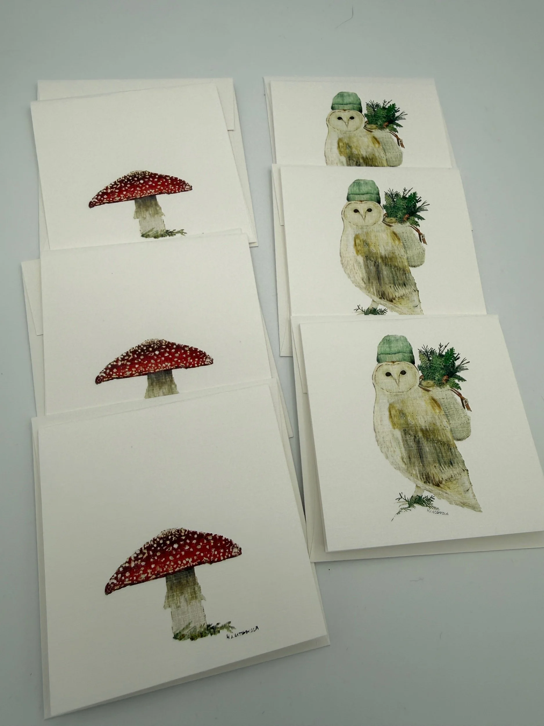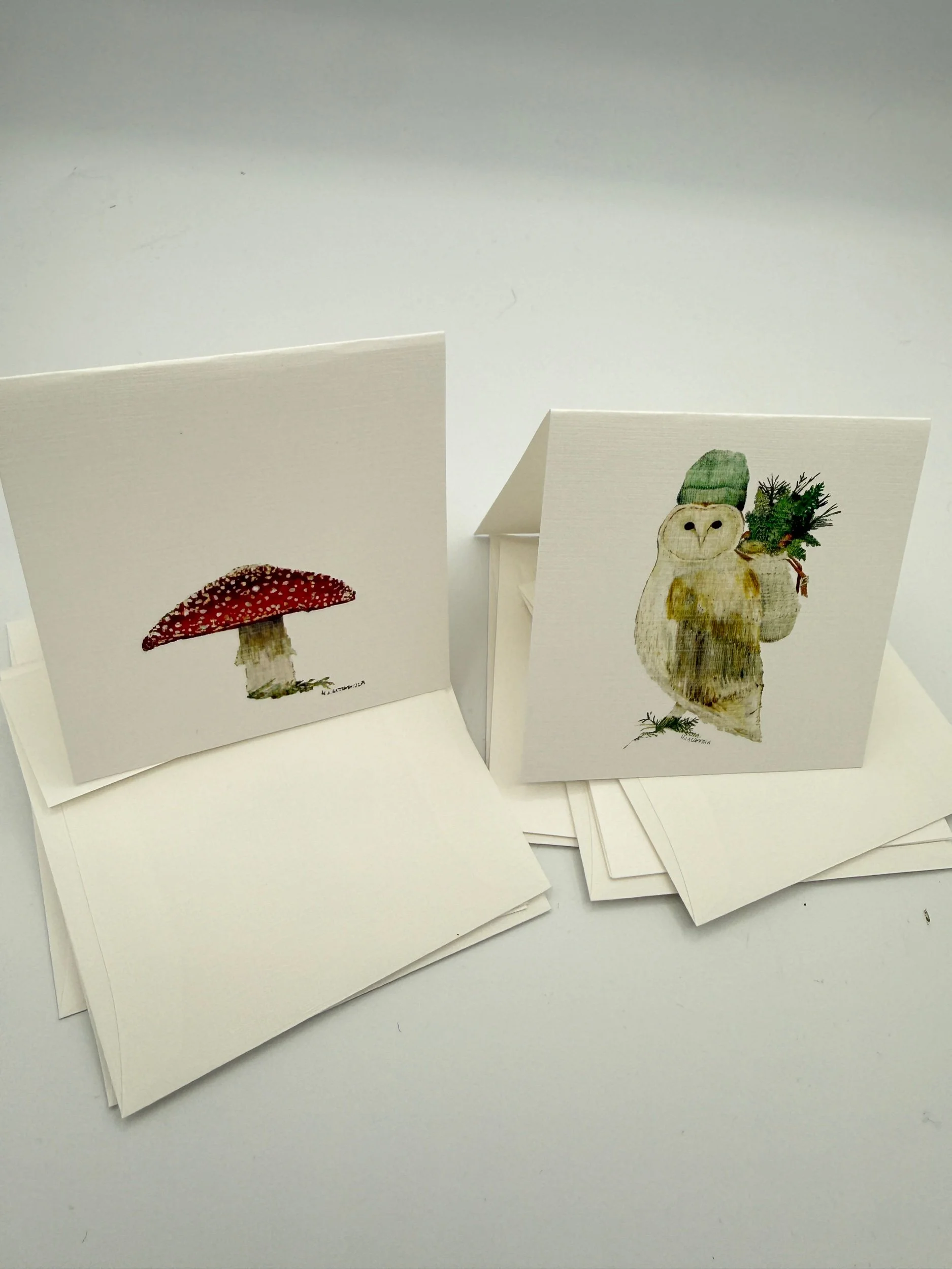 This sweet mini card set includes 6 3”x3” cards printed on linen textured paper with envelopes. Each card is blank on the inside and comes with a protective sleeve. The set includes 3 owl and 3 mushroom designs in each set. These make great gift tags!